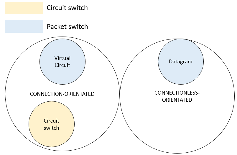 - Virtual circuit - setup a circuit. Sender and receiver communicate directly (connection orientated).